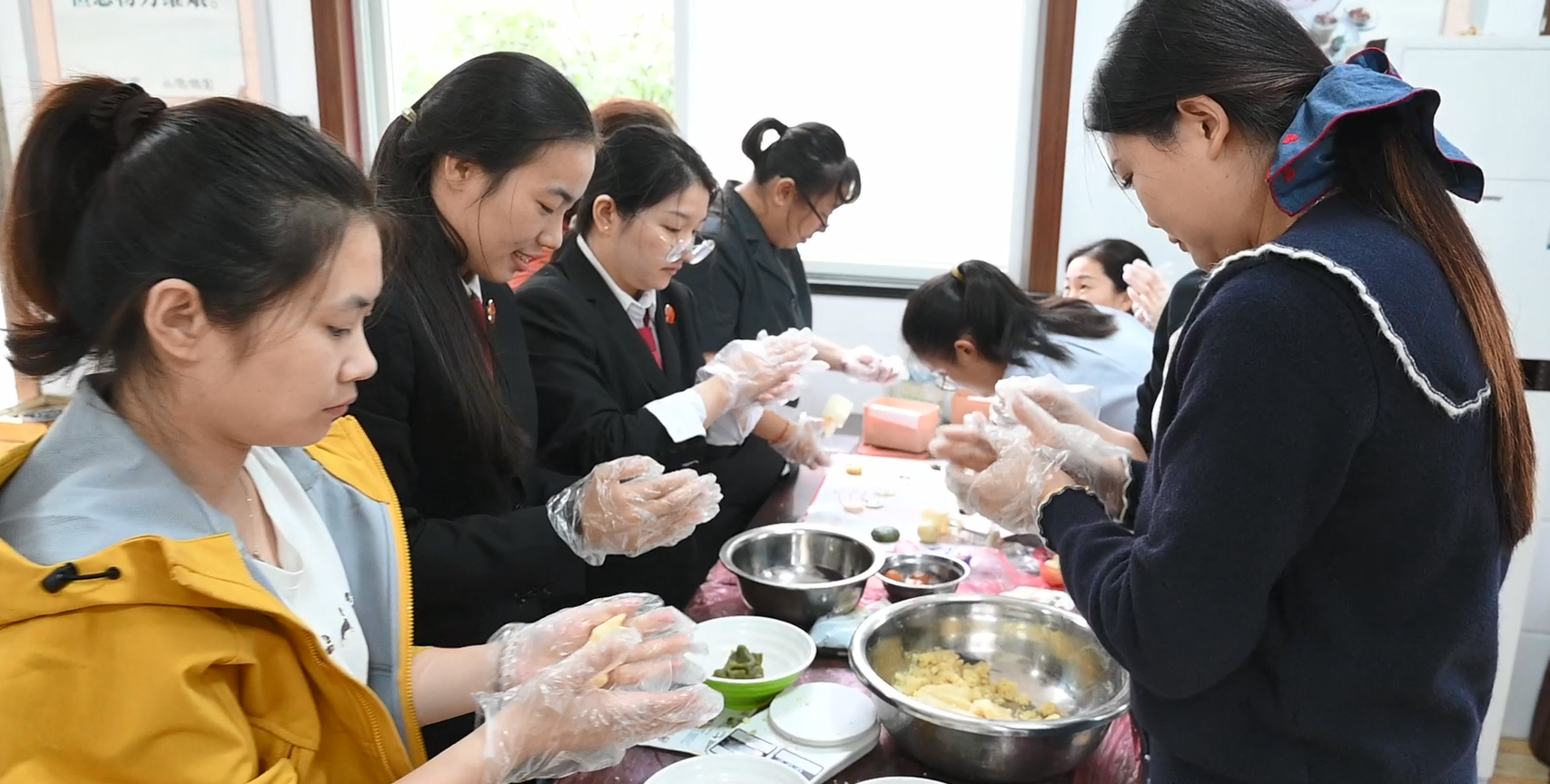平日工作时严肃认真的法院干警们,在活动现场纷纷化身成拥有一双巧手的厨艺达人,大家聚在一起,揉面团、包馅料、压模具,制作月饼的每一步都充满了欢声笑语。
