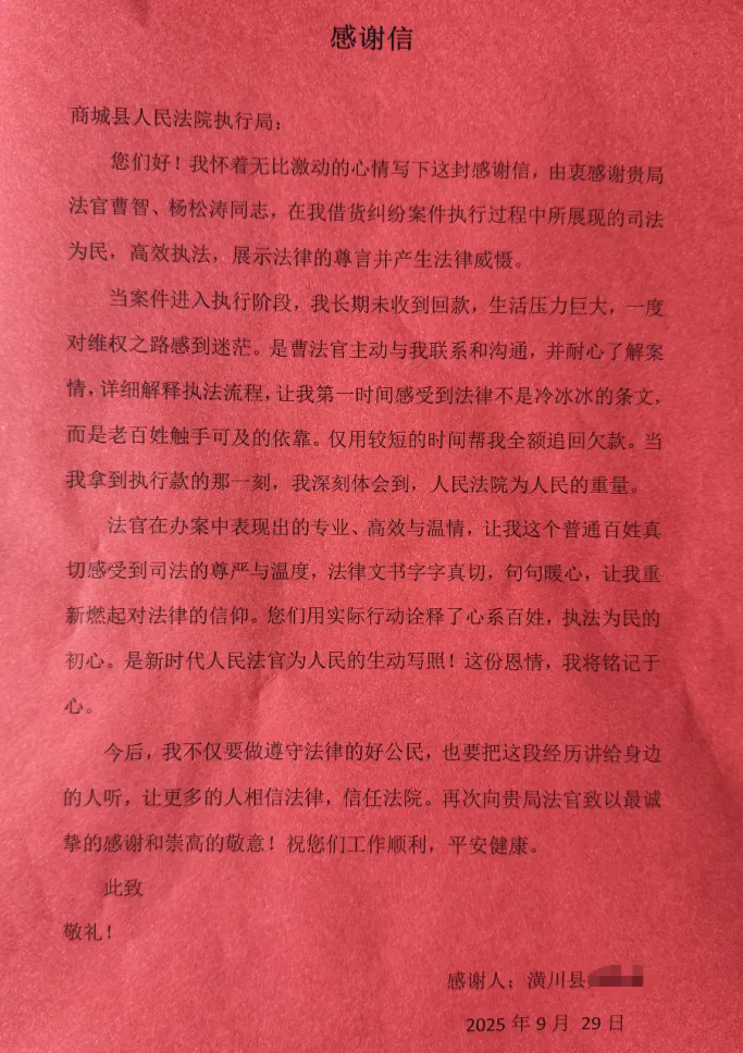 那些年里,黄某早已不抱什么希望。直到他在商城法院执行局,收到那条银行到账短信,看着屏幕上跳出的数字,愣了神,反复确认了好几遍。一旁,执行人员曹智安静地等着,脸上带着浅浅的笑意。
